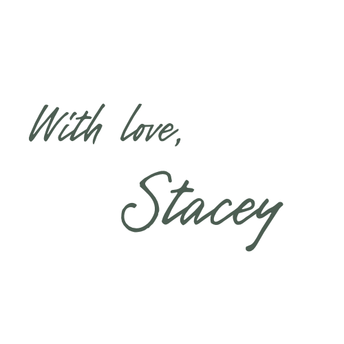 A digital graphic with a black background showing the text 'With Love, Stacey' in gray, handwritten-style font.